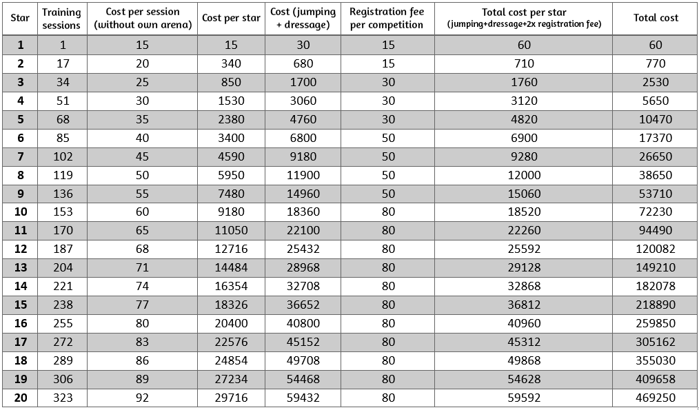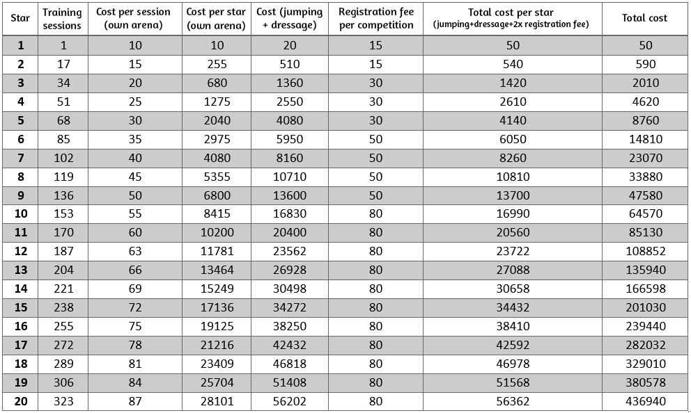 Here you can find a clear overview of the training costs per star. Please note: 1 star stands for from star 0 to star 1, so the costs your horse incurs when it has 0 stars are listed under 1, because you are training towards star 1.
