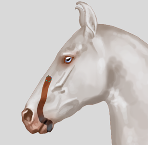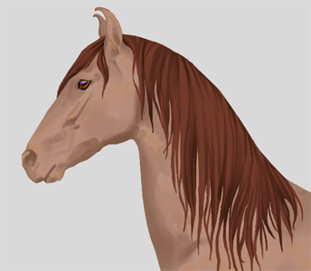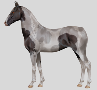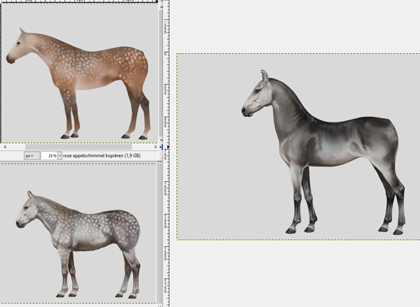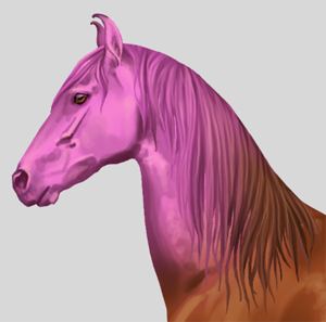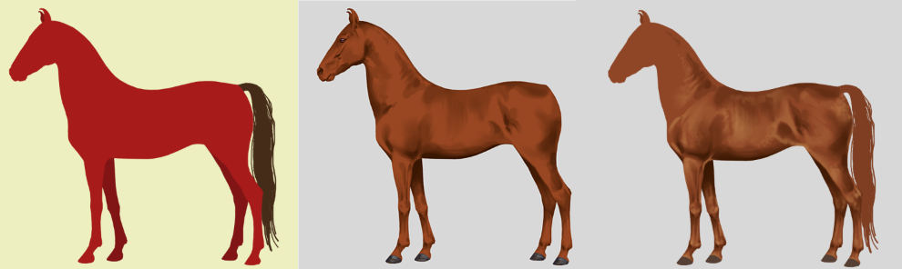 Als de grayscale eenmaal klaar is, kan er verkleurd worden! De marwari heeft 19 verschillende kleuren en 15 verschillende patronen (en daarnaast de normale aftekeningen). Ik pas de basiskleur eerst aan (linker plaatje), en daarna geef ik de schaduw en lichtval lagen ook hun eigen kleur. Ik speel graag met wat kleurverschillen en maak bijvoorbeeld bij de donkerbruine kleur de lichtinval blauwig op sommige stukken.