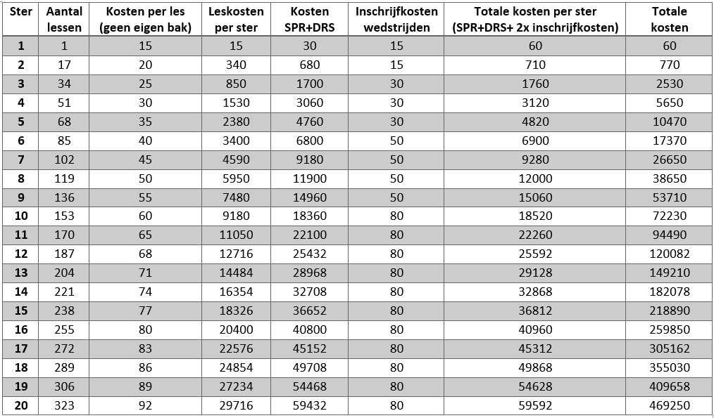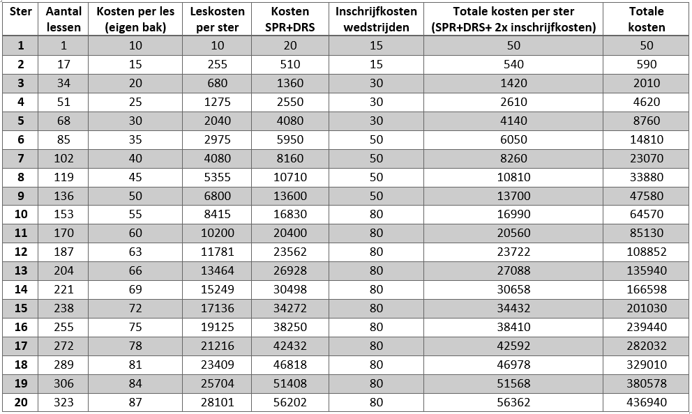 Hier kun je een duidelijk overzicht vinden van de trainkosten per ster. Let op! 1 ster staat voor van ster 0 naar ster 1, dus de kosten die jouw paard maakt als deze 0 sterren heeft staat bij 1, omdat je naar ster 1 toe traint.